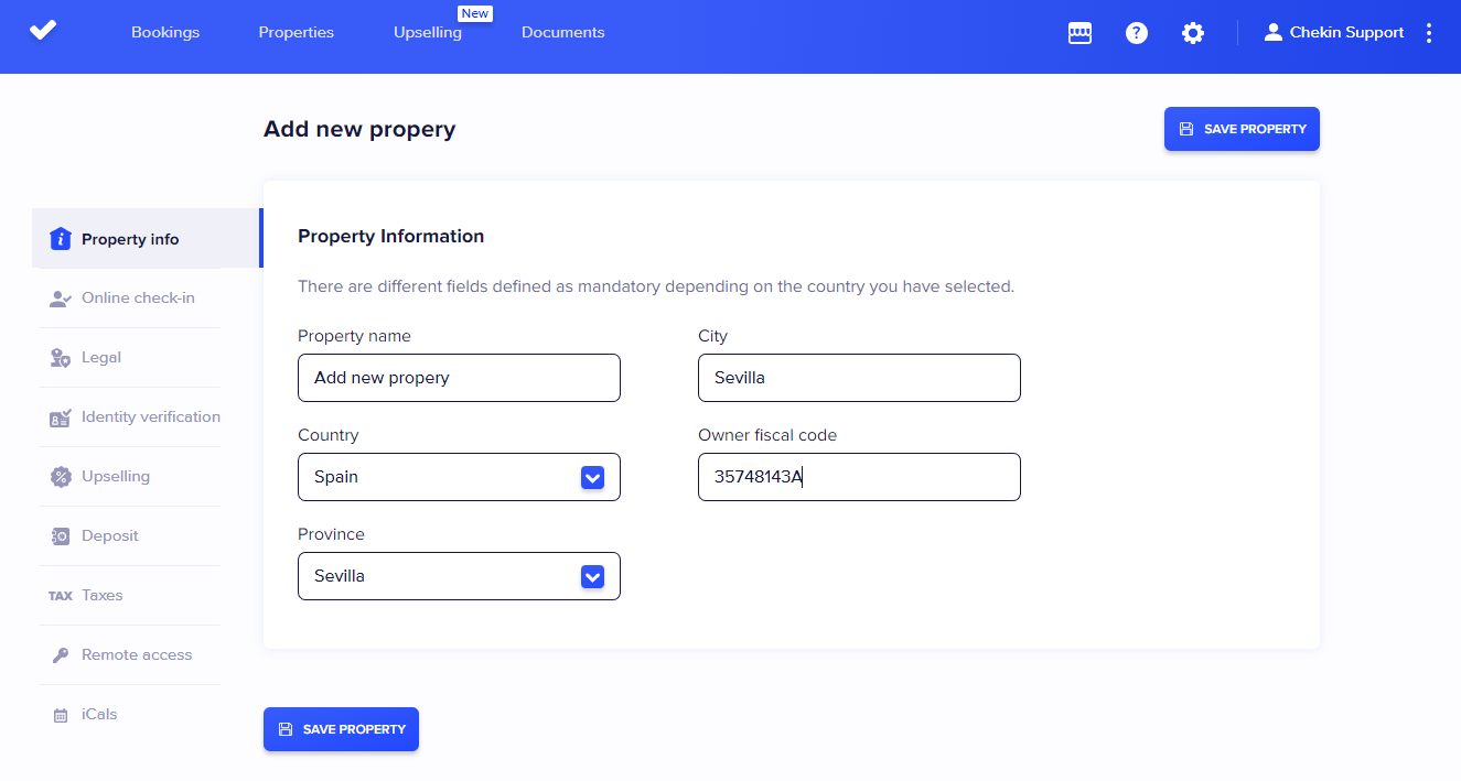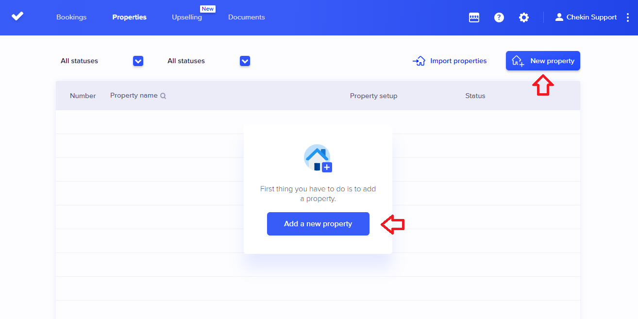 Para empezar a utilizar Chekin, lo primero que debes hacer es añadir tus propiedades ya que son necesarias para vincular toda la información de conexión con la policía, reservas, documentación entre otras cosas.