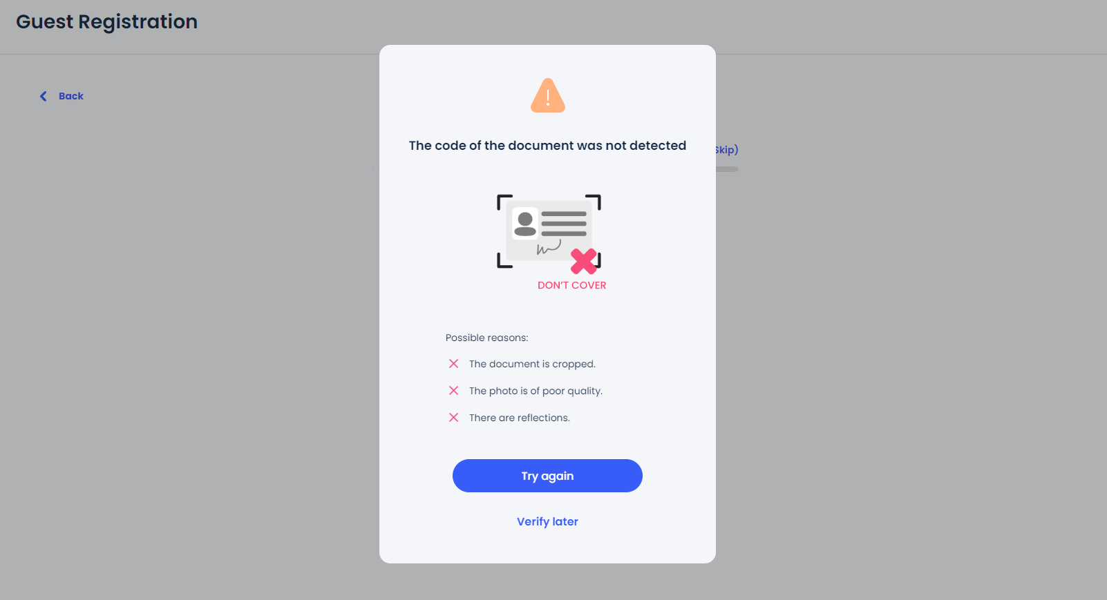 Si elige esta opción y su invitado recibe este mensaje de error, no podrá continuar con el proceso. Tendrá que repetir la foto hasta que el código MRZ sea lo suficientemente bueno como para que el escáner lo acepte.