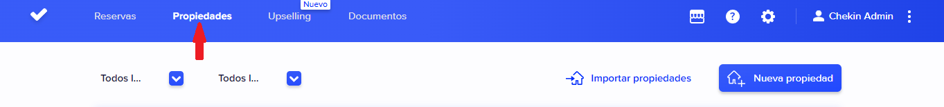 En primer lugar, debes iniciar sesión en tu cuenta de Chekin desde la plataforma web e ir a la pestaña "Propiedades" dedashboard.