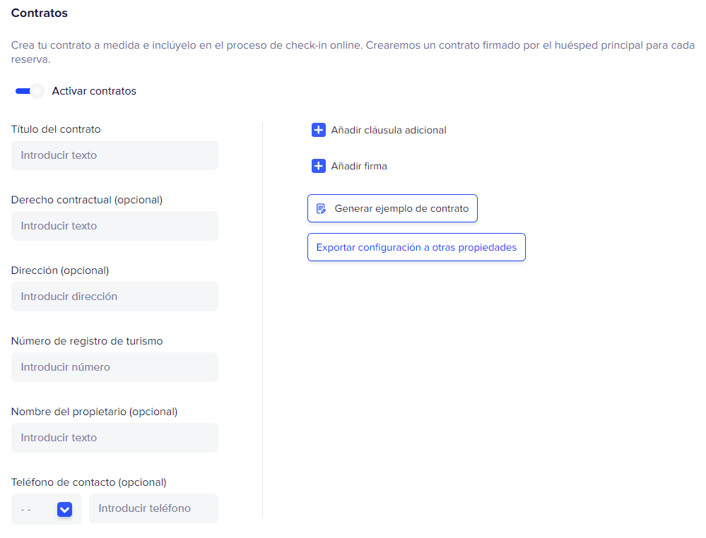 Importante: puedes utilizar la misma configuración de contrato en diferentes propiedades. Para ello, haz clic en el botón "exportar configuración a otras propiedades" y selecciona la propiedad a la que quieres copiarla.