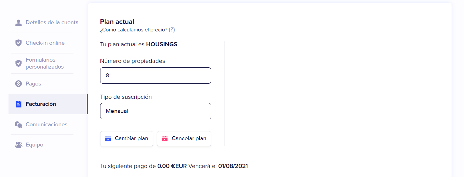 Una vez hayas accedido a la configuración de tu cuenta, debes hacer click en el apartado "Facturación". Aquí encontrarás una cuadro con la información básica de tu suscripción titulada "plan actual". Los datos que te proporciona incluyen el tipo de plan que has escogido (hotel o alojamiento turístico), el número de propiedades o habitaciones y por último el tipo de suscripción que has contratado (mensual o anual).
