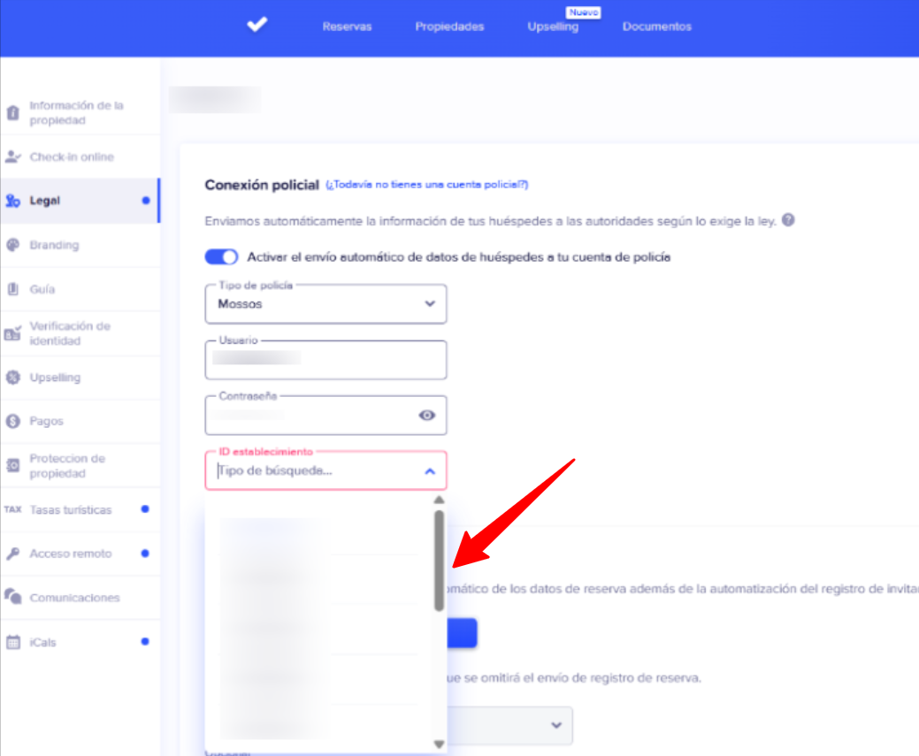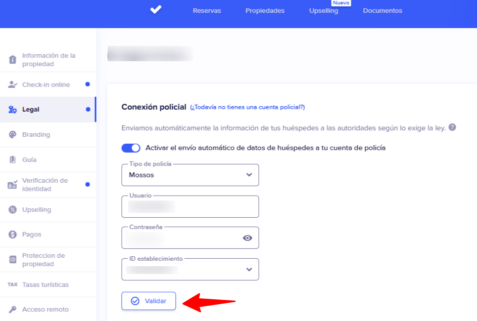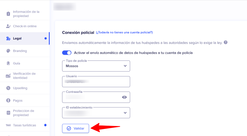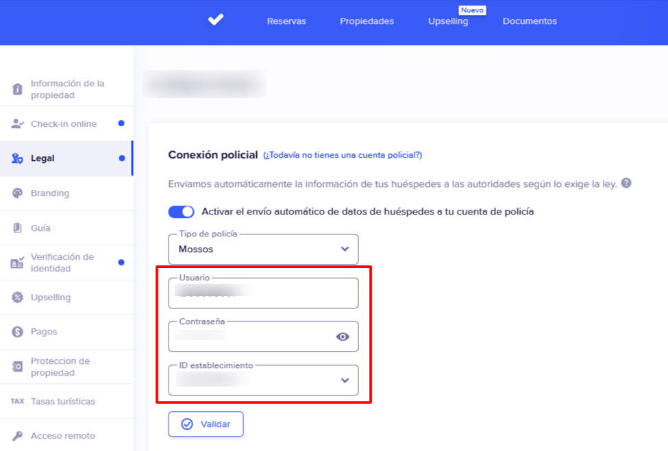 NOTA: Si tus reservas están generando un error, es posible que no tengas añadido el número de establecimiento en la sección LEGAL. Para solucionarlo, haz clic en VALIDAR, lo que hará que aparezca el campo de ID de establecimiento. Luego, selecciona el ID del desplegable y haz clic en VALIDAR nuevamente.