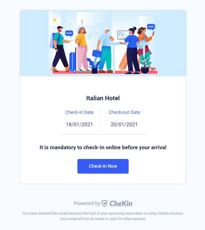 Como se mencionó anteriormente, puedes enviar un correo electrónico al huésped con solo un clic. El correo electrónico utiliza una plantilla predeterminada con información breve sobre tu propiedad y un botón con el formulario de registro.