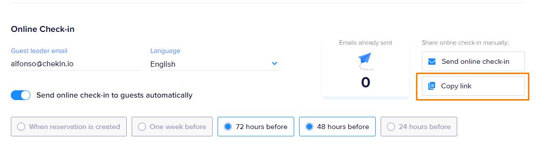 Desplázate hacia abajo hasta la sección "Check-in Online" y añade el correo electrónico del huésped, en caso de que esté vacío.