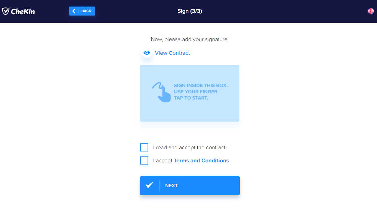 3 - Añadir firma / aceptar términos: Se puede completar la firma usando el ratón o el dedo (si la página se abrió en el móvil) para dibujar la firma. También hay una casilla de verificación con los términos y políticas de privacidad que los huéspedes deben aceptar.