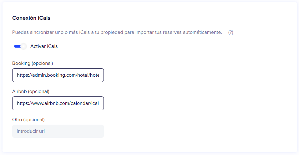 Para el campo "Otro", puede pegar cualquier tipo de iCal que no sea Airbnb o Booking, sin embargo, tenga en cuenta que algunas empresas generan el iCal con información diferente y no podrían funcionar correctamente, si ese es el caso, puede comunicarse con el soporte para investigar el iCal.