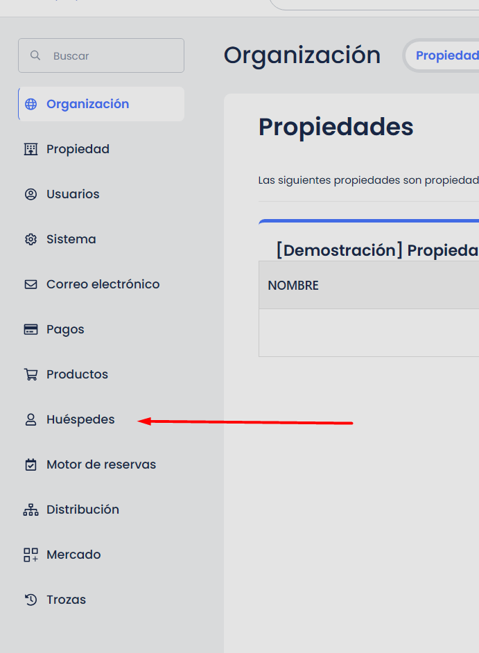 3. En la siguiente pantalla, en la parte izquierda debemos clicar en Huéspedes.