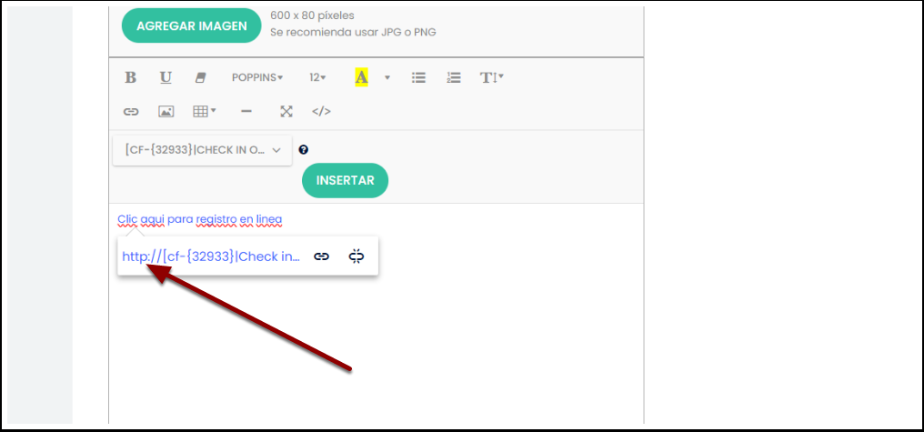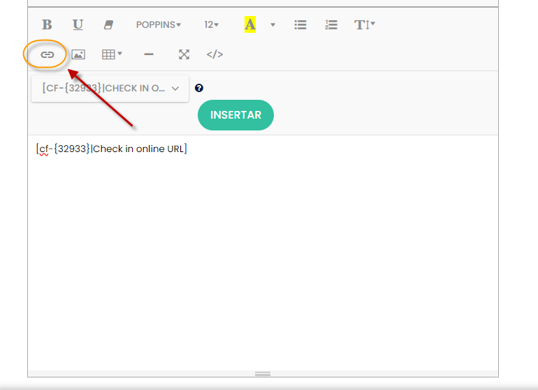 5. Seleccionamos el campo personalizado agregado y hacemos clic en el icono de hipervínculo: