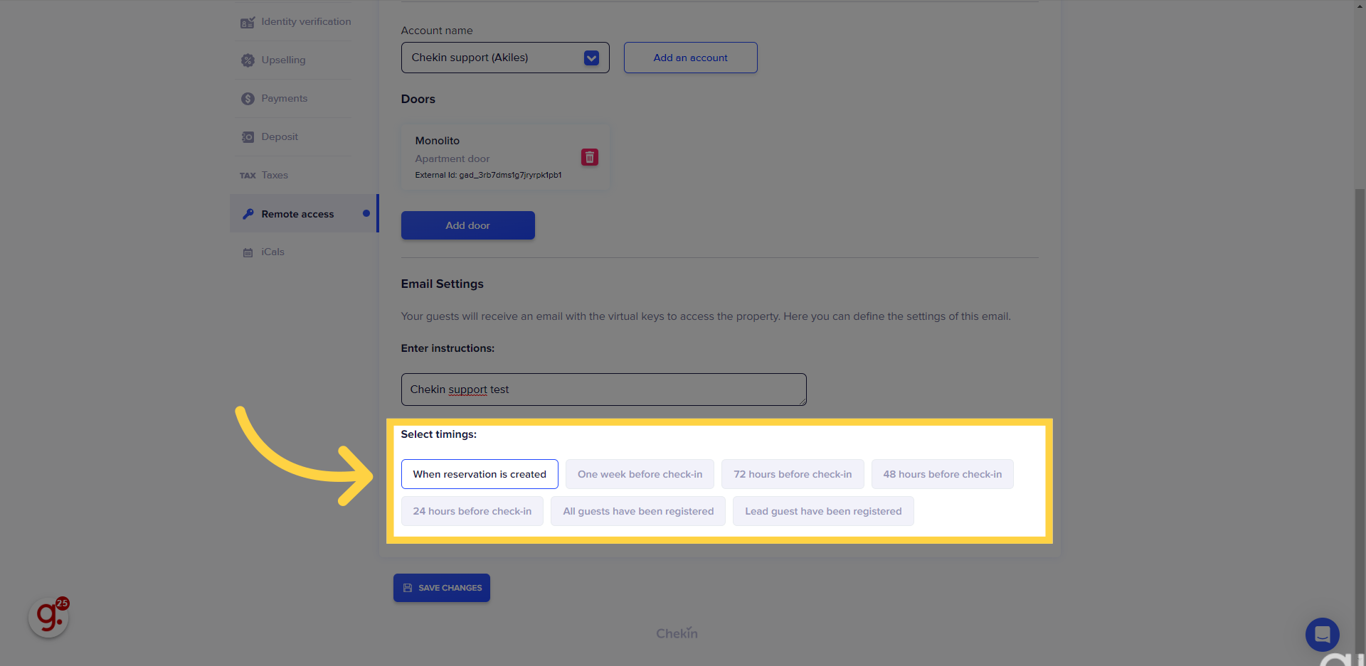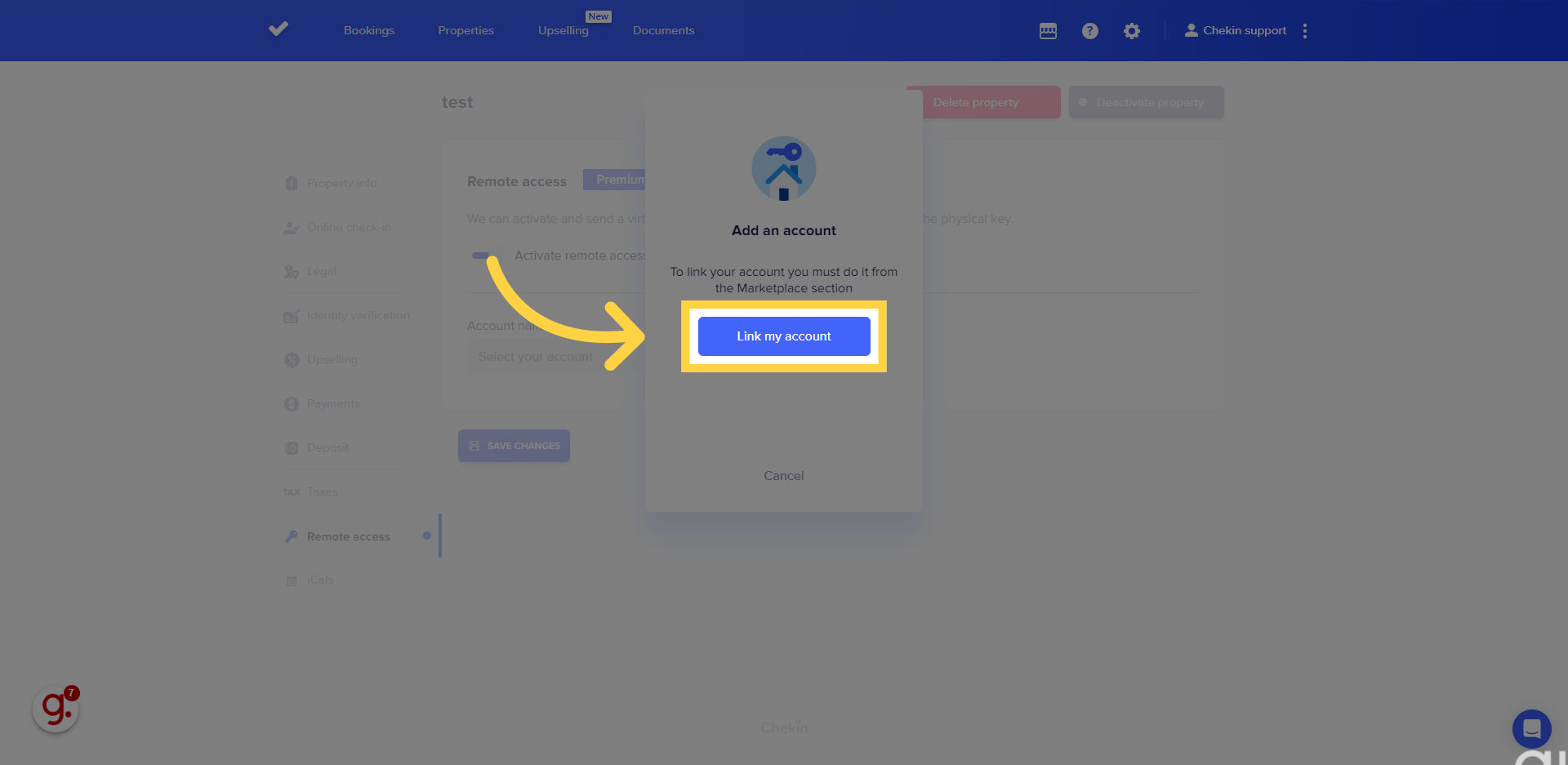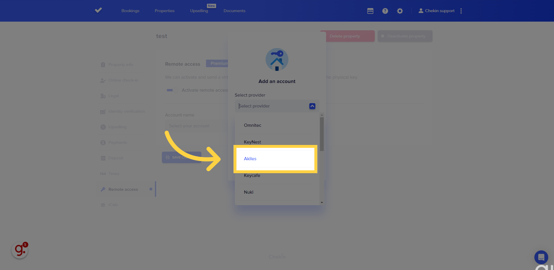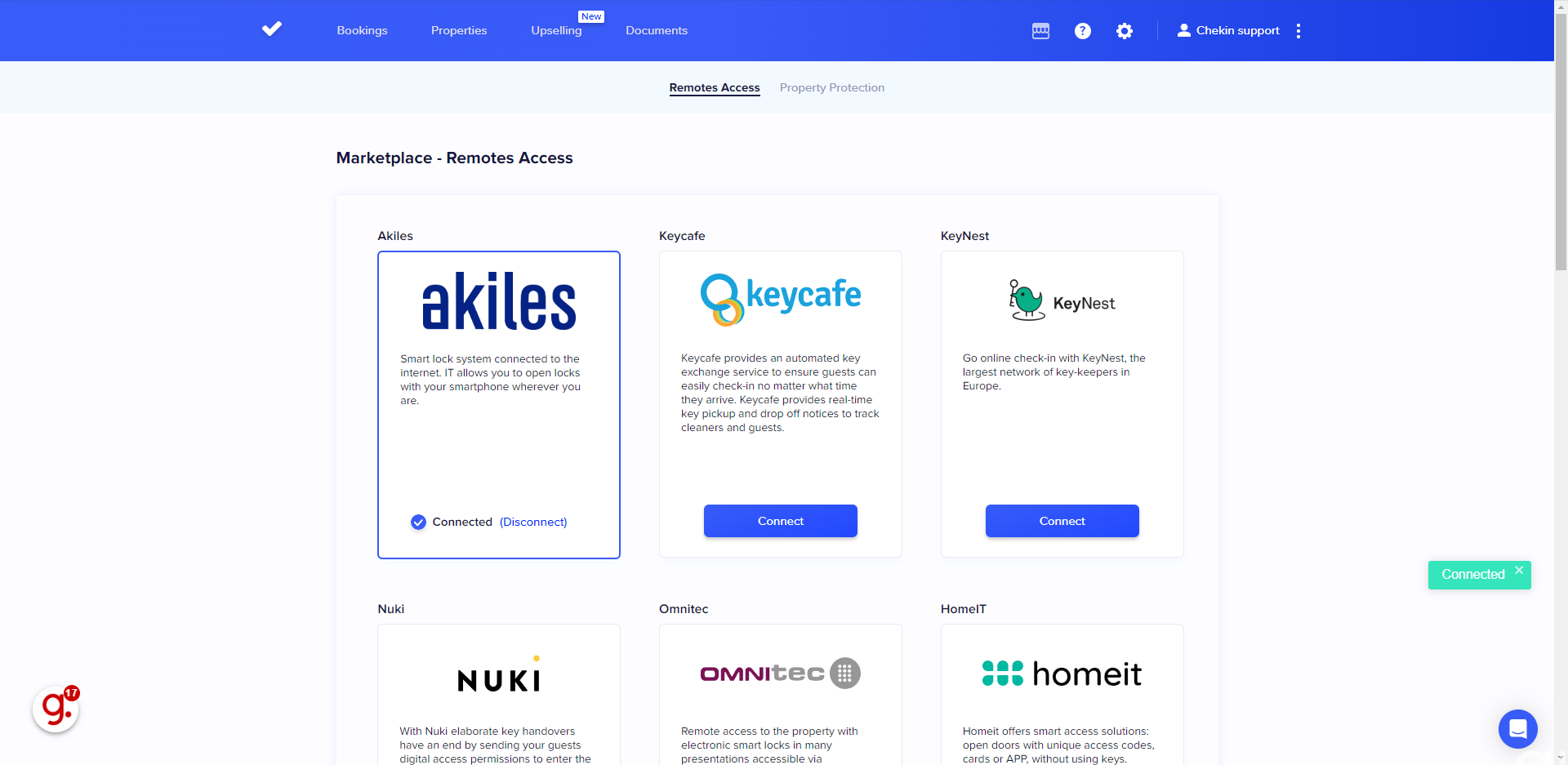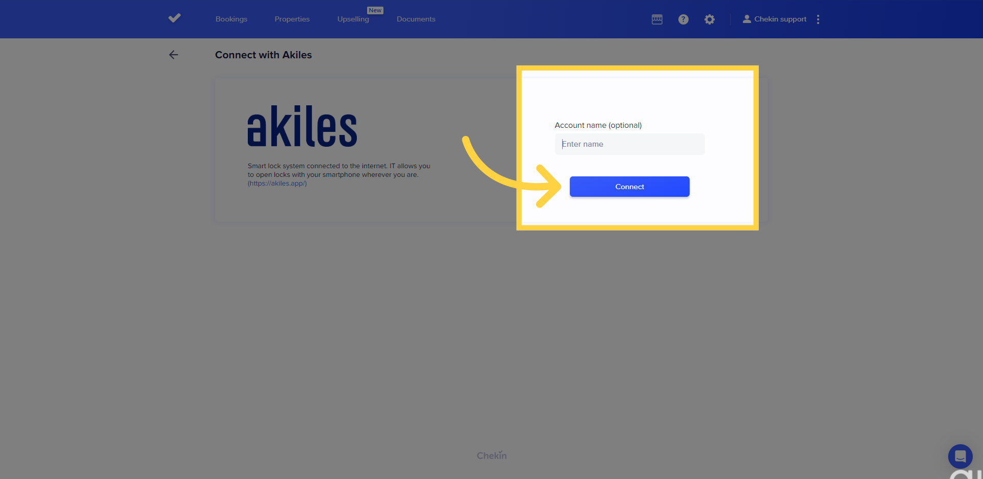 Puedes conectar tu cuenta de CheKin con Akiles en la pestaña Acceso Remoto de tu propiedad.
