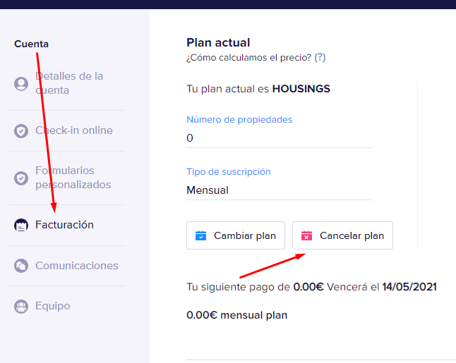 Puede cancelar su suscripción a Chekin en cualquier momento que desee, yendo a la sección de Facturación de su panel de control y haciendo clic en "Cancelar plan":