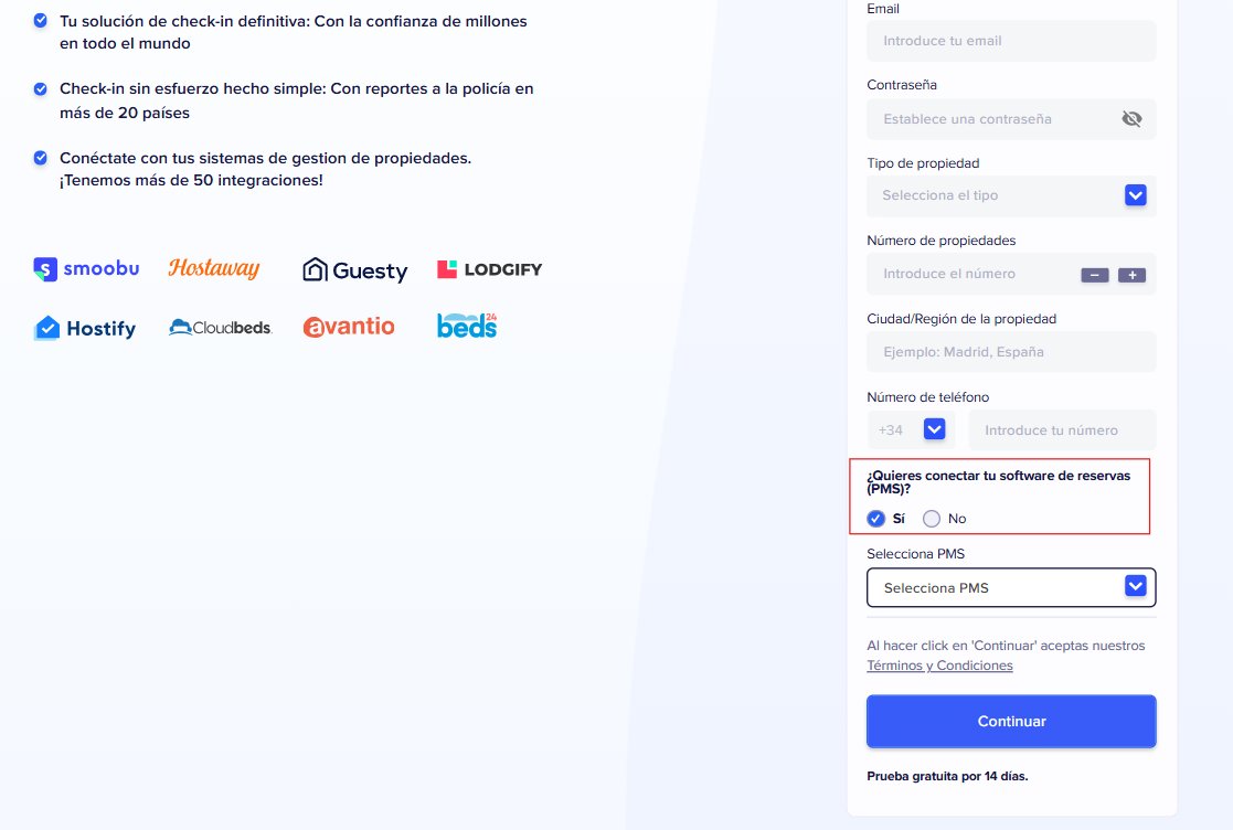 3. Para la pregunta "¿Quieres conectar tu software de reservas (PMS)?", debes marcar "Sí".