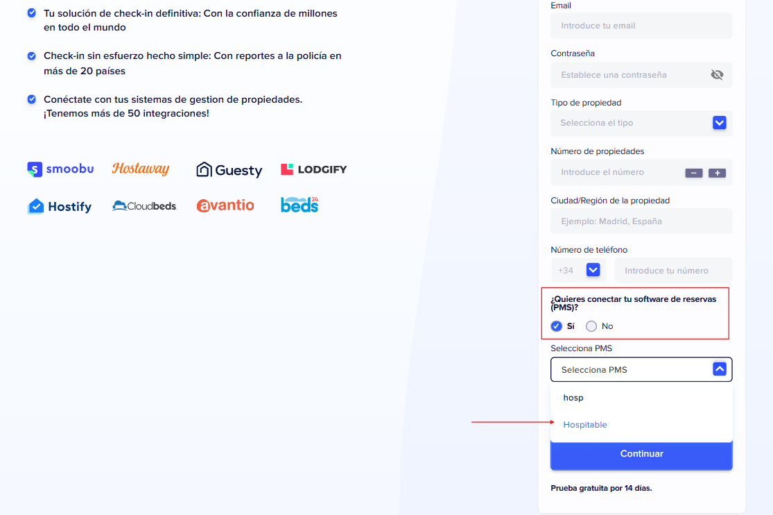 4. Una vez seleccionado "Sí", aparecerá un desplegable titulado "Selecciona PMS", donde debes elegir Hospitable.