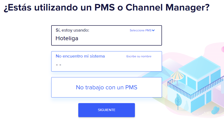 En el tercer paso, cuando el formulario de registro le pregunte si está utilizando un PMS o Channel Manager, selecciona Hoteliga entre las opciones y haz clic en "SIGUIENTE":