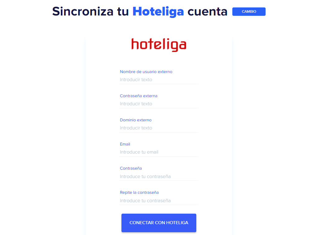 En ese momento, se te pedirá que introduzcas tus credenciales de acceso a la cuenta de Hoteliga (externo) y las credenciales que quieras utilizar en tu nueva cuenta de Chekin: