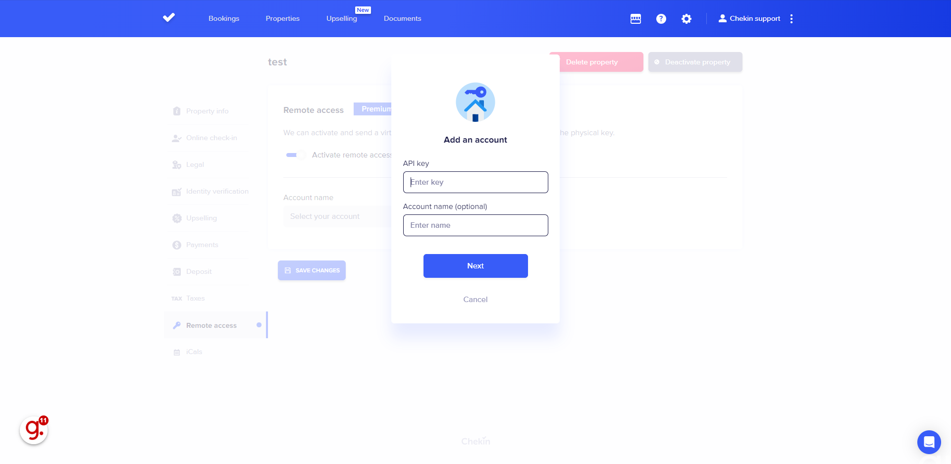 Añade tu API key y haz clic en "continuar" para conectar Chekin y HomeIt