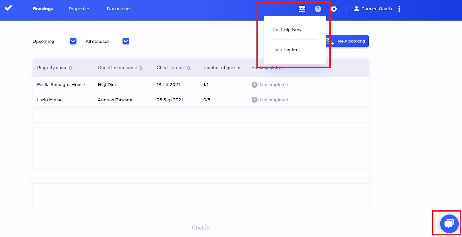 Si tienes dudas o encuentras problemas a lo largo del proceso, puedes obtener ayuda fácilmente desde tu panel de control haciendo clic en el icono del signo de interrogación en el banner superior. Tienes 2 opciones: visitar nuestro centro de ayuda o chatear con nosotros. También puedes utilizar el chat haciendo clic en el icono de la esquina inferior derecha: