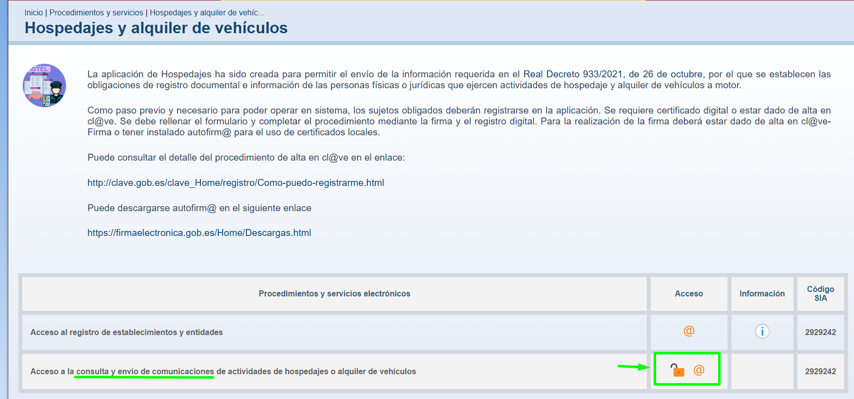 Desde la página web de SES, accede a la segunda opción: "Acceso a la consulta y envío de comunicaciones de actividades de hospedajes o alquiler de vehículos" para iniciar sesión, ya sea con certificado (icono @) o con usuario/contraseña (icono de candado).