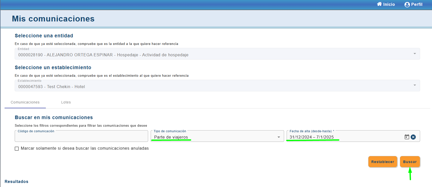 3. Configura el "Tipo de comunicación" (si es Registro de viajeros "Parte viajeros" o Registro de reservas "Reserva de hospedaje"), selecciona el rango de fechas y haz clic en el botón de búsqueda.