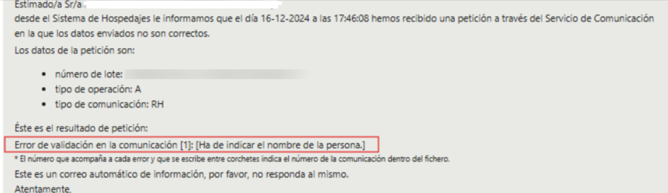 Si has recibido un correo por parte de SES Hospedajes indicando ese error, se refiere al envío de la reserva en sí a SES. No se ha podido enviar debido a que el nombre del huésped no está en la reserva en Chekin.