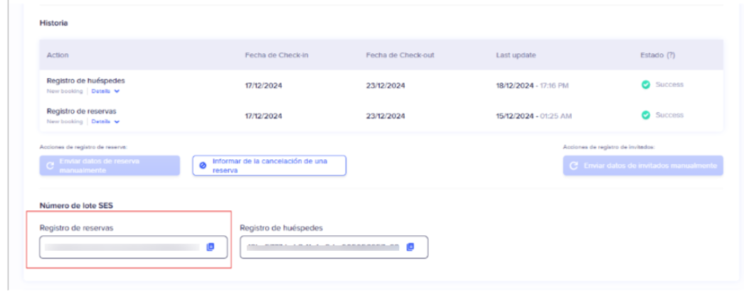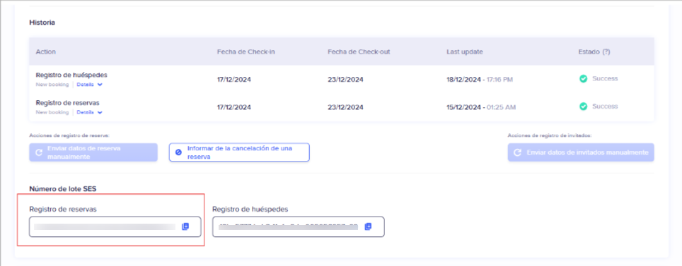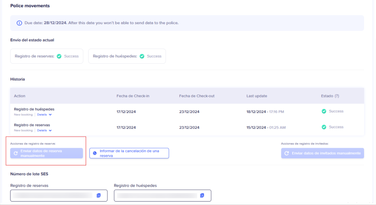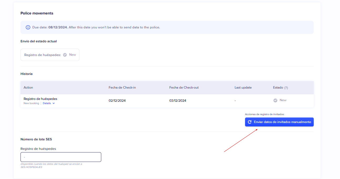 El envío a SES Hospedajes se diferencia del envío a la Policía Nacional/Guardia Civil porque ya no verás directamente el estatus de "enviado".