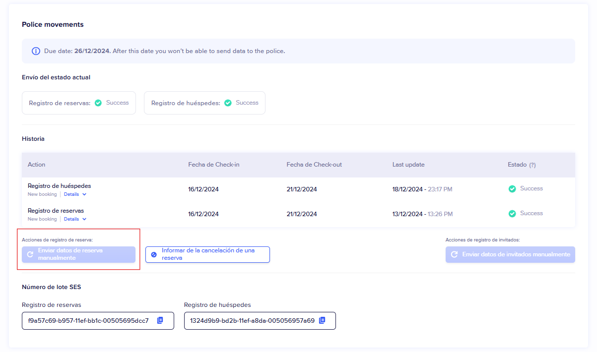 4. Desde la reserva, en la sección ´Police Movements´ hacer clic en el botón ´Enviar datos de reserva manualmente´