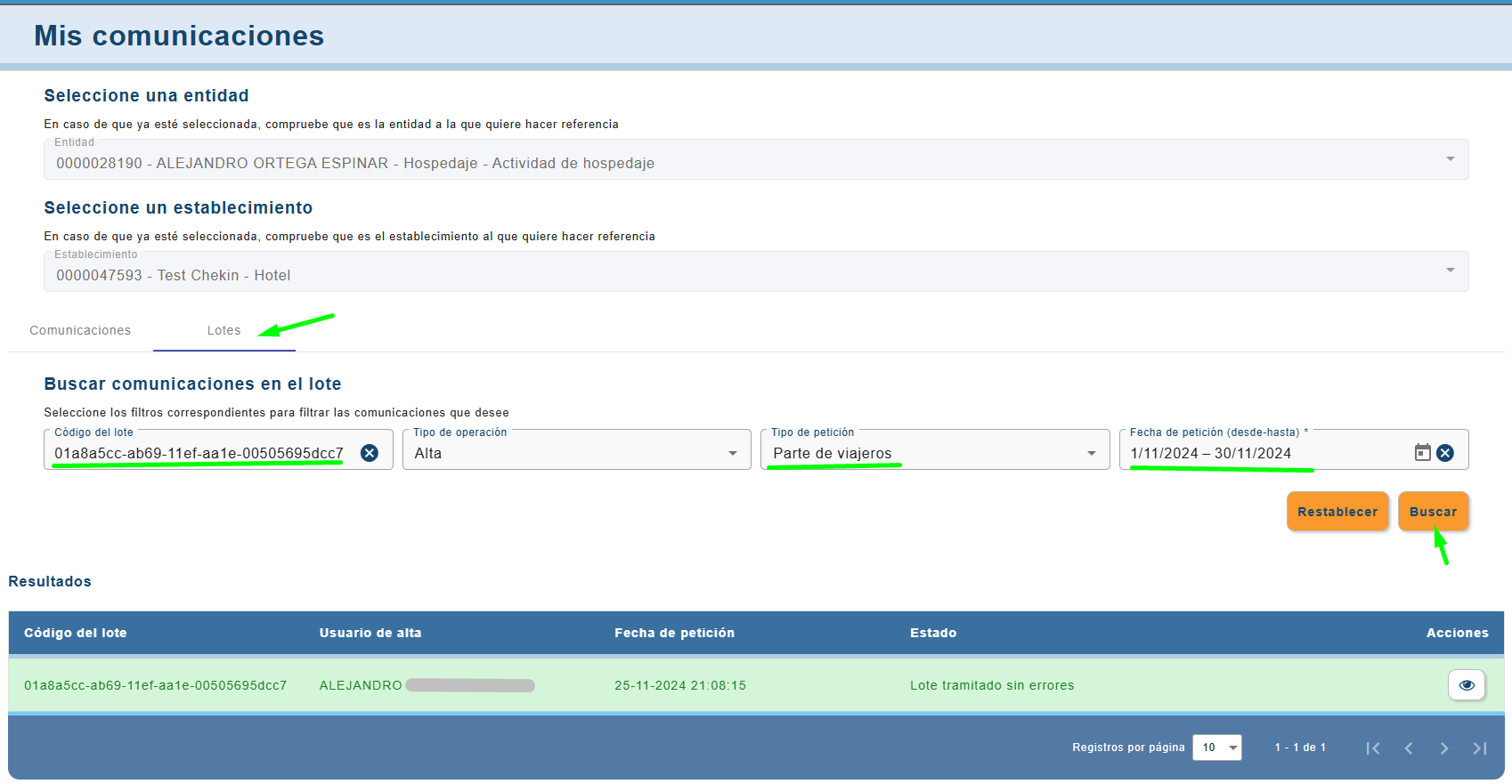 Introduce el código del lote, selecciona el tipo de solicitud y el rango de fechas, y haz clic en buscar.