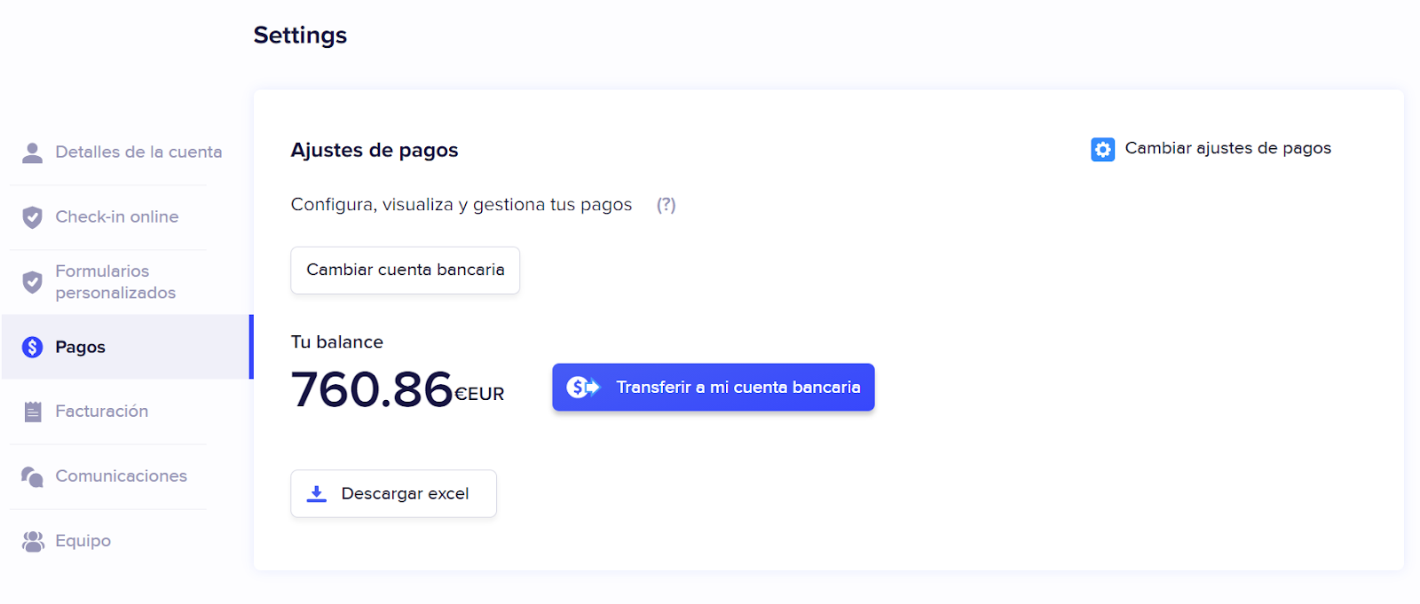 Todos los pagos de tus huéspedes se van acumulando en un balance en tu cuenta de Chekin que puedes ver en los ajustes de pagos dentro los ajustes generales.